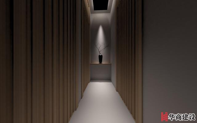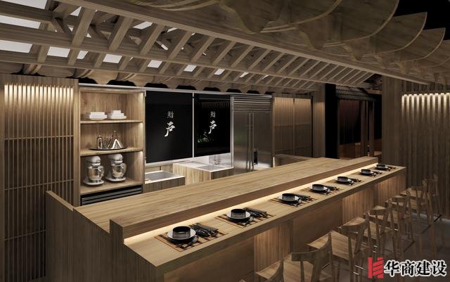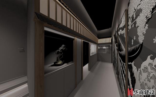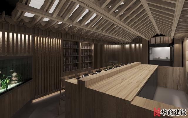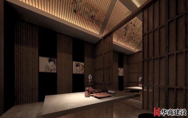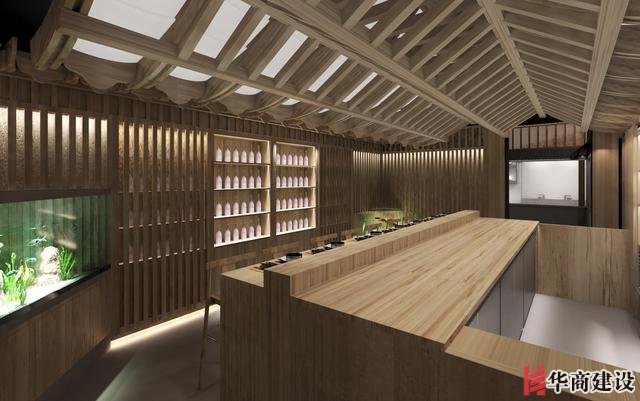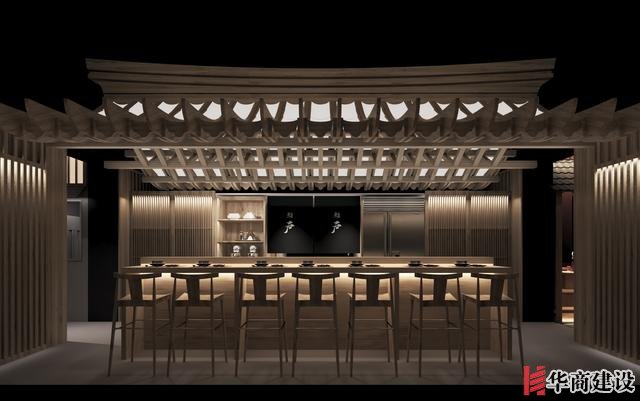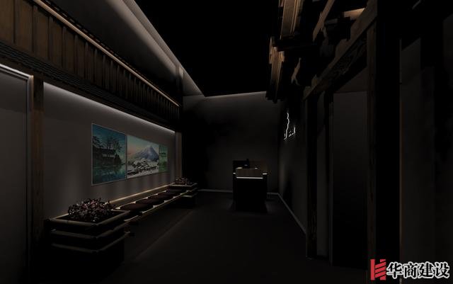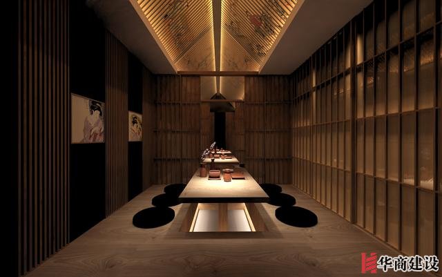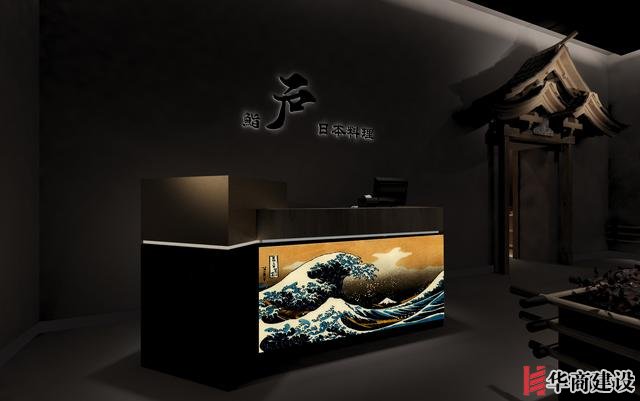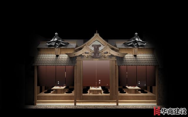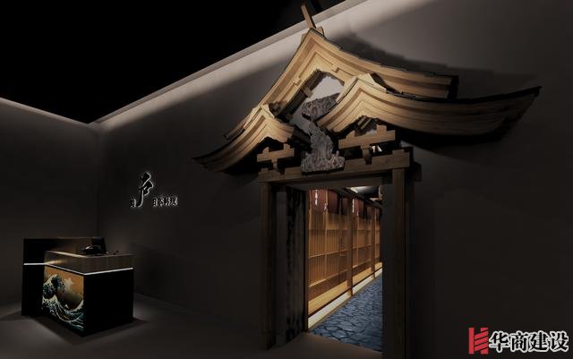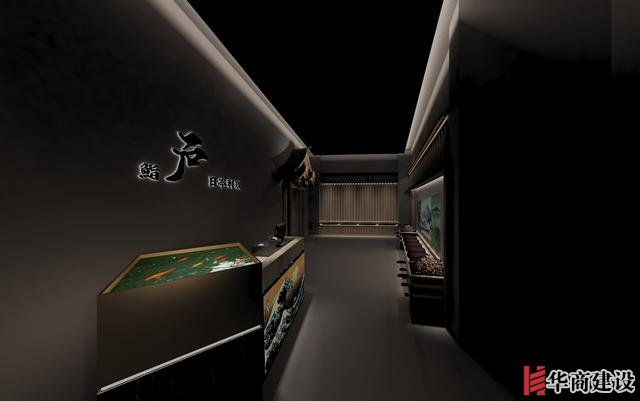 本案在設計中利用該店狹長的特點將日本建筑理念融入餐廳空間設計,創作出日本胡同的延伸感。整體設計以日本原生文化為基調,在空間裝飾上以木制材料為主,配以青石、屋檐、壁畫、雕塑營造出濃郁日本文化和古樸自然之美。而屋脊端頭鬼瓦的裝飾看似不經意,卻最能襯托出日式“精致”之感,在餐廳入口處設置流動氣息的水池,代表著靜中有動的生命力,與整體沉穩內斂的基調形成對比。