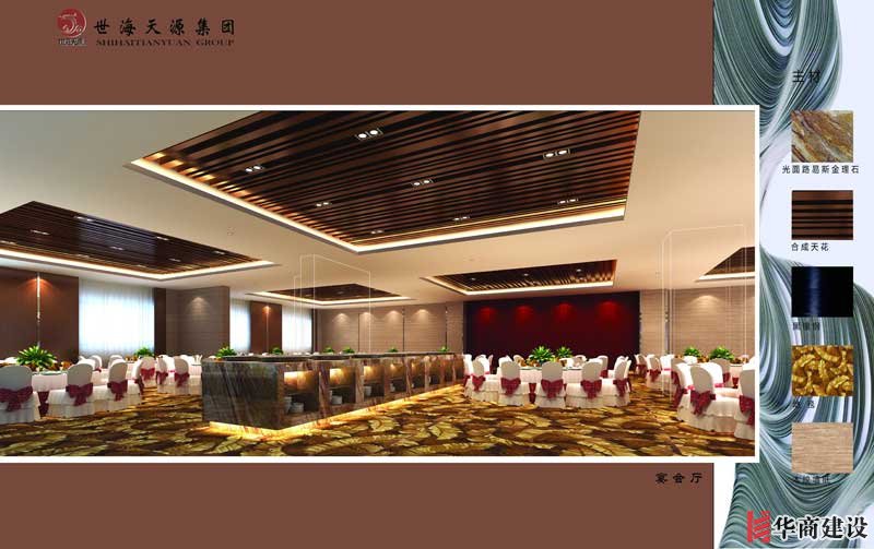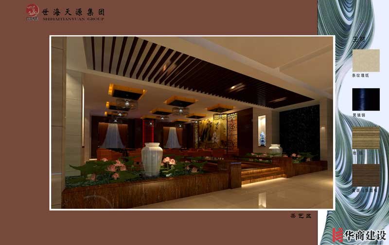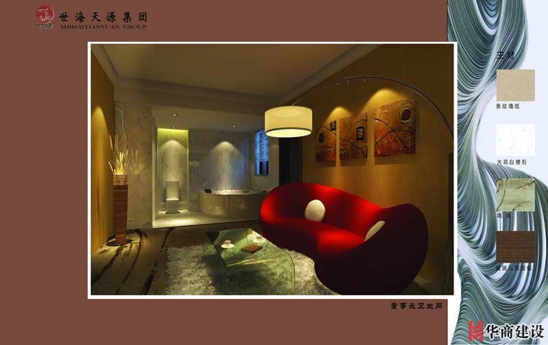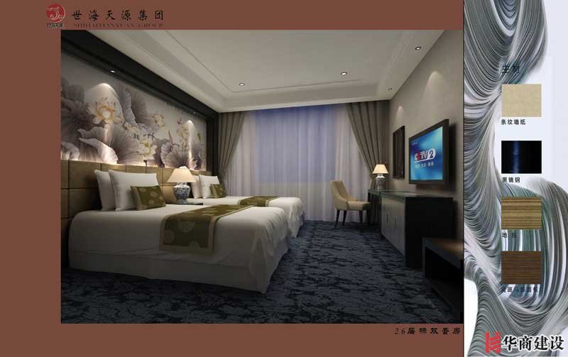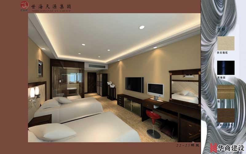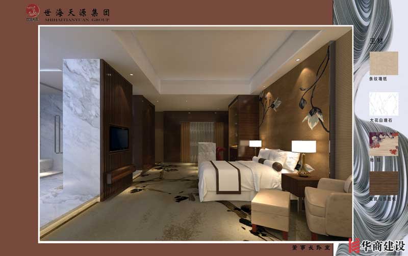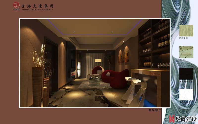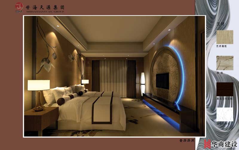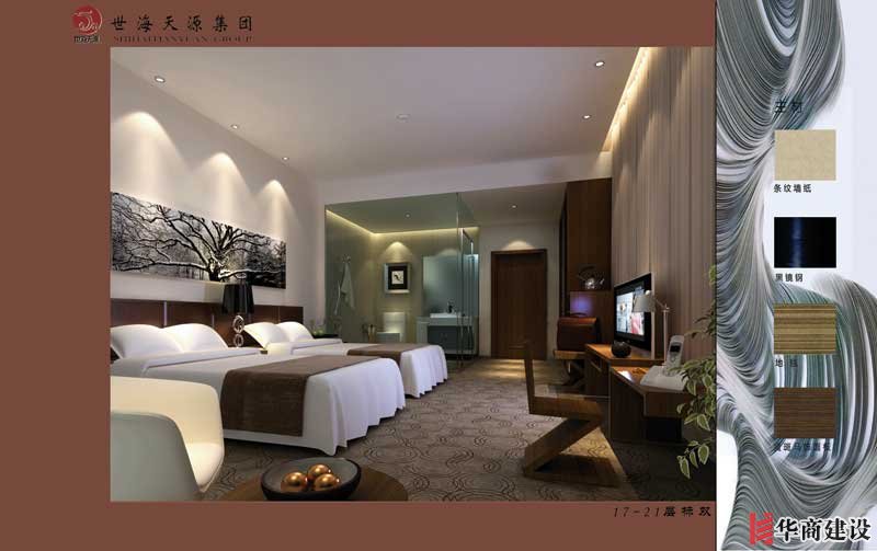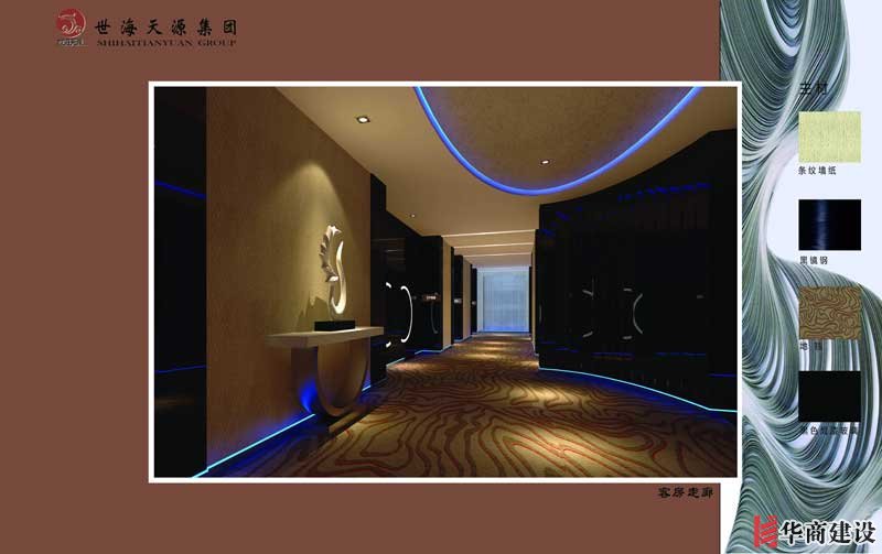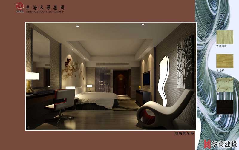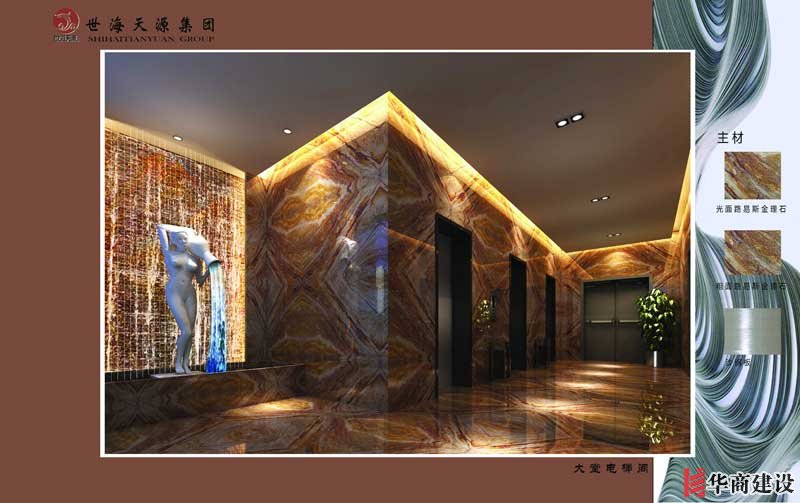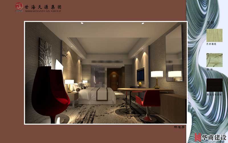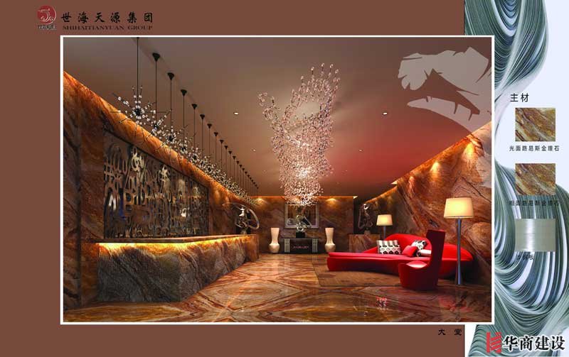 結合空間的藝術特點,設計師特別注重了材質的搭配和對比,光滑與粗糙、黑與白,相互的撞擊著,強化了空間的質感,并豐富著視覺的層次。大堂以紋路豐富的路易斯金為主材,光潔明亮的墻面和天然粗礪的服務臺形成強烈的對比,營造出自然、淳樸、溫暖的氛圍,獨具匠心的大堂吊燈,充滿了童心稚趣,也有大珠小珠落玉盤之勢,非常引人注目。除此之外,在軟裝和家私擺設上也經過深思熟慮的考究,在進入電梯間的入口處的藝術水景更是增添了更多的藝術成分,創造出優雅、閑適的氣質。客房空間以大花白石材、黑鏡鋼和黑玻及藝術墻紙為主材,把空間營造出層次豐富、質感十足。