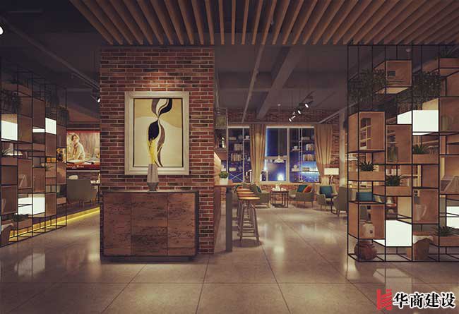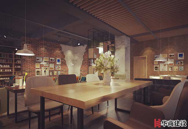 在本案工業風咖啡館吊頂設計上,我們依然采用了大面積的裸露水泥頂,只是簡單的做了色彩的處理,另外在咖啡館的局部區域,我們的吊頂風格采用了木質鏤空格柵的裝飾設計手法,與店面內的裝飾風格毫不違和、自成一體。