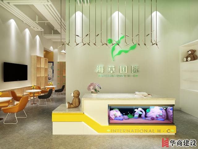 海草國際前臺設計,整體的設計符合培訓班海草的主題,在色彩上主要采用的是藍色、綠色、黃色,首先在視覺上給人眼前一亮的感覺。
