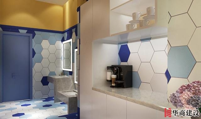 茶水間的設計,墻面、地面背景主要采用的是藍色和白色相結合,相得益彰