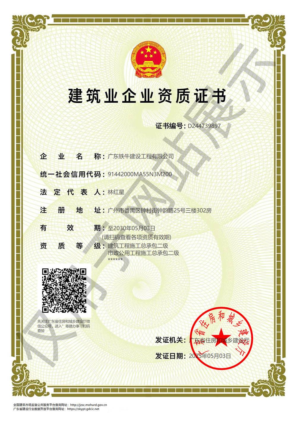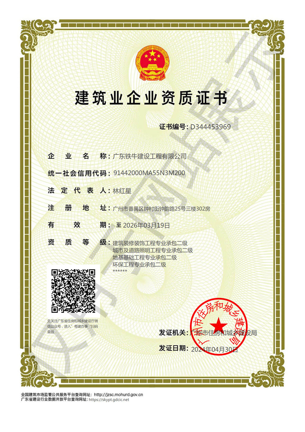 公司現(xiàn)具有國家住建部頒發(fā)的多項資質(zhì)。建筑工程施工總承包、建筑裝修裝飾工程專業(yè)承包、市政公用工程施工總承包、地基基礎工程專業(yè)承包、環(huán)保工程專業(yè)承包、城市及道路照明工程專業(yè)承包等,并且公司建立了科學完善、運轉(zhuǎn)高效的管理體制,各專業(yè)技術力量配套齊全。