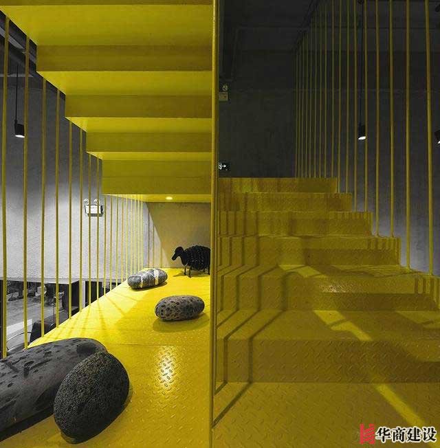 黑+黃是非常經典的顏色搭配,實際運用在生活中的各種場景,既有時尚意味又有強烈的視覺沖擊力。于是,所有功能性的器物、墻面、地面、頂面都為黑灰色,而樓梯裝置則刷成了黃色。沒有特意多余的造型堆砌、用最基礎的結構,通過顏色的對比,把樓梯的裝置感體現出來,成為空間視覺焦點。由外往內一望,巨大的黃色樓梯裝置如雕塑般躍然于空間之中,強烈的視覺沖擊力營造出新都市時尚感,油然而生的想法:這是一個很酷的美發空間。