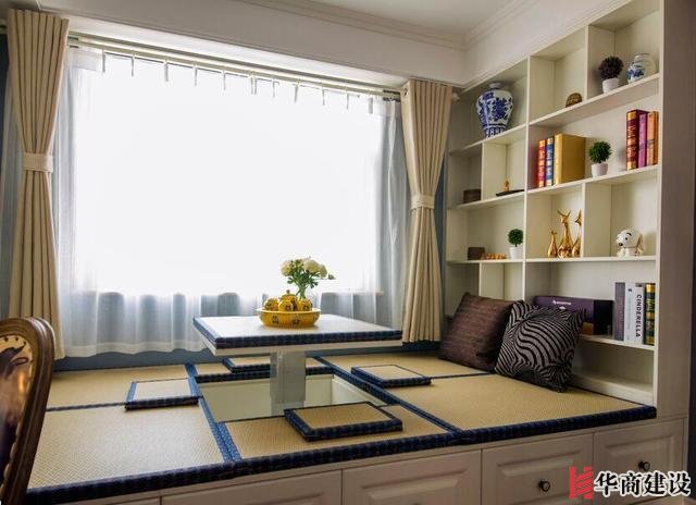 擔心墻面都是柜子顯得壓抑的話,還可以選擇榻榻米+展示架,放一些裝飾物,書籍、花瓶、鐘表、相框、綠植等等,提升美感,讓房間更加有活力。
