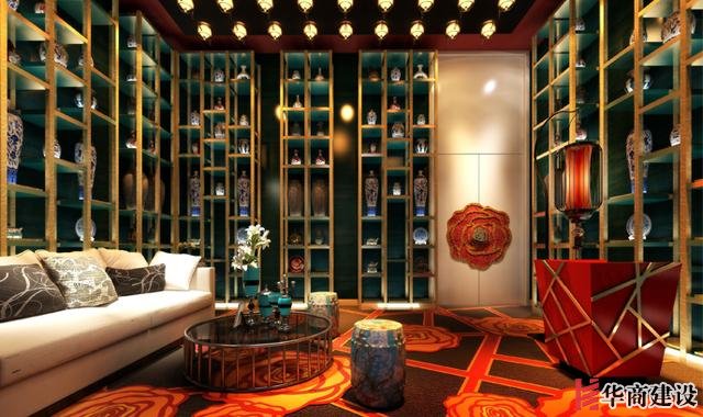 這個包房的設計首先從外觀上來看給人一種非常高端的感覺,無論是天花板的設計,還是地板的設置,都是高雅不俗,細心的我們可以看到包房中還設置了電視,電視的兩邊還掛有紅色的擺件,給人一種非常熱鬧、喜慶的感覺,非常適合一家人在一起聚餐,既有家庭的溫馨,又高端上檔次。